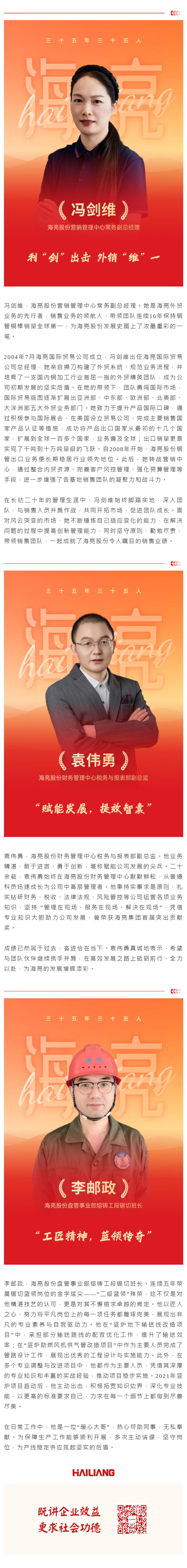 今年是海亮集團創業35周年。35年來,全體海亮人堅持“聽黨話、跟黨走”,一路披荊斬棘、砥礪奮進,成就了集團從小到大、由大圖強的跨越式發展。為表彰先進、鼓舞斗志,激勵全體海亮人接續奮斗、聚力有為,書寫企業發展新篇章,集團評選出35位在各個領域具有代表性的先進人物,授予“35年35人”榮譽稱號。