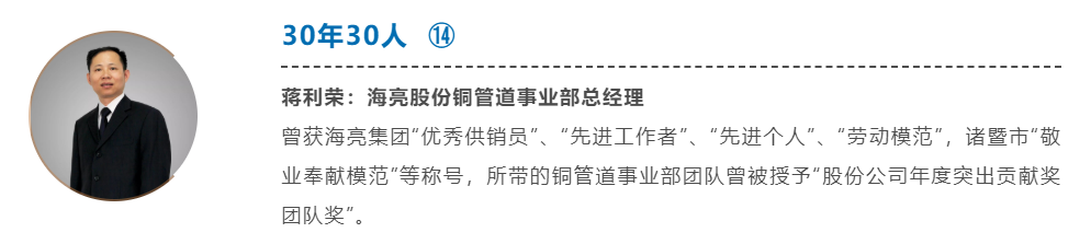 1993年,蔣利榮以普通營銷員的角色開啟了他的海亮生涯,他一步一個腳印,兢兢業業,勤奮耕耘,一路成長到總經理。在擔任營銷副總的8年時間里,他帶出了一支高素質、強戰斗力的營銷員隊伍,使銅管道的銷售收入增長了近10倍。