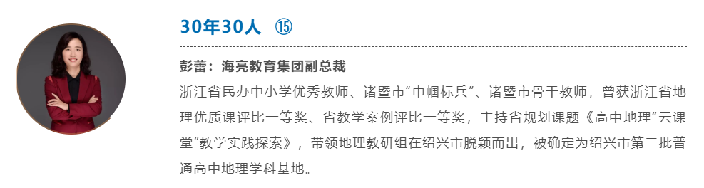 她兢兢業業,深耕在教育教學第一線,實力斬獲各項榮譽;她不斷發展創新,推出了一系列適應現代學校發展的舉措,培養了一大批出色能干的教學管理干部;她從教學干事、教務主任到教學副校長、校長,再到現在的海亮教育管理集團副總裁。一路走來,她總是堅守要為學生謀成長,為老師謀幸福,為學校謀發展的初心,緊緊跟隨海亮教育發展的浪潮,苦練內功,砥礪前行。她就是彭蕾。