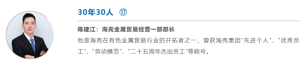從一名朝氣蓬勃的退伍小兵哥成長為海亮有色金屬貿易的中流砥柱,入職22年,他將人生最美好的時光奉獻給了海亮,無怨無悔!他,就是海亮金屬貿易集團有限公司經營一部部長陳建江。
